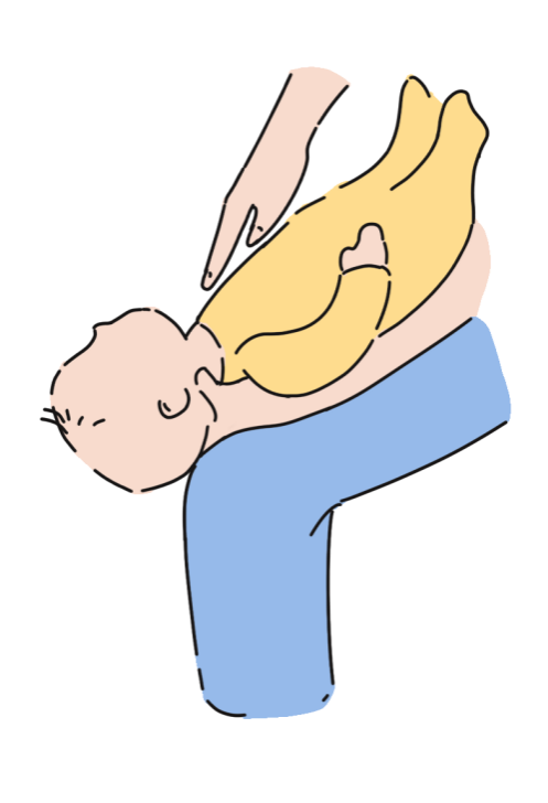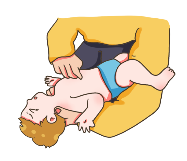 拍背法。施救者用一手托住被救儿童的颧骨两侧,手臂托在幼儿的胸前。另一手扶住孩子的后颈部,以大腿为支撑,让孩子的脸朝下,呈头低脚高位。在孩子背部和两肩胛骨之间用掌根向前向下快速冲击拍打5次。