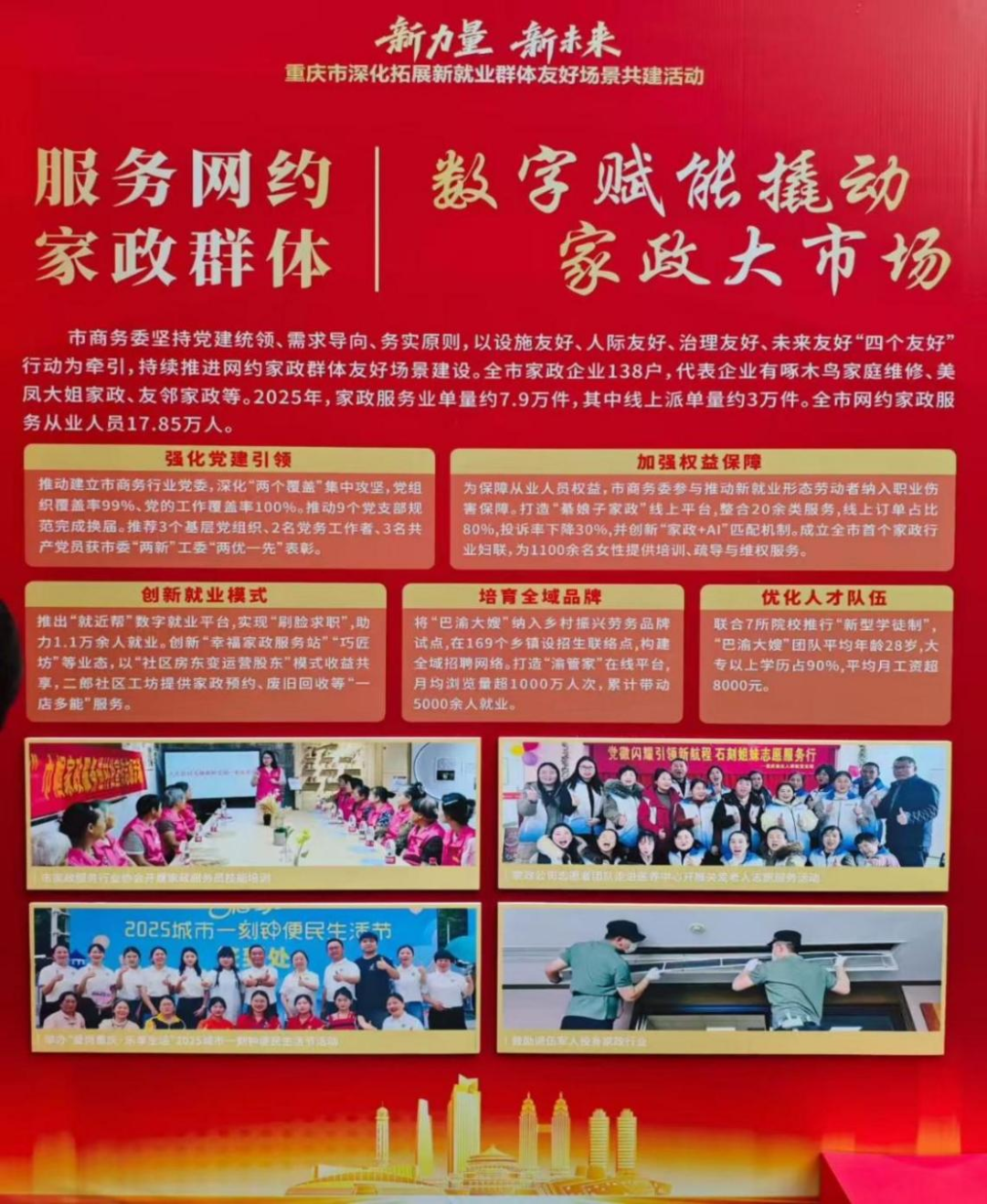 【党建工作】我会部分企业应邀参加重庆启动新就业群体友好场景共建行动我会部分企业应邀参加 重庆启动新就业群体友好场景共建行动 ![]() 1月25日,由重庆市委社会工作部、重庆市渝中区委主办的 “新力量・新未来” 重庆市深化拓展新就业群体友好场景共建活动温馨启幕。市委副书记陈新武,市人大常委会副主任屈谦,市政府副市长、渝中区委书记黄茂军,市政协副主席杜惠平出席活动,一同出席的还有来自市级相关部门及渝中区的 25 位领导同志。 ![]() △新就业群体参会现场 在市商务委综合党委的悉心指导下,我会党支部深刻感受到党组织对网约家政行业的高度关注与有力引领。正是在党的坚强带领下,协会明确了服务网约家政从业者的工作方向,制定了针对性的工作计划,愈发重视从业者权益保障与行业规范发展。此次活动中,协会精心组织 20 家优秀网约家政企业及从业者参会,让大家现场感受各级领导的关怀与支持,也让党建引领成为网约家政行业高质量发展的坚实支撑。 ![]() ![]() ![]() △市、区级相关领导了解网约家政情况 活动伊始,中共重庆市委社工部部长、中共重庆市委非公有经济组织和社会组织工作委员会书记邹勇发表了热情洋溢的致辞,并祝福大家在新一年里幸福满满、收获满满。随后网约家政等七类新就业群体典型人物依次登台,讲述在党委政府和全社会的关怀帮助下树立人生目标、实现自我价值的励志故事。他们用一句句质朴又有力的心声,道出了新就业群体扎根城市、服务城市的热忱。 ![]() △我会网约家政代表“大田小家”曾令碧参与诗朗诵表演 活动现场,重庆市委社会工作部、重庆市人力社保局、重庆市住房城乡建委等部门联合发布新就业群体友好服务项目。市委社会工作部相关负责人介绍,该部会同 21 个市级部门及有关单位策划集成 100 项服务项目,涵盖建成新就业群体综合服务阵地超 7000 个、各类友好单元超 4 万个,开展职业技能培训 15 万人次以上等内容,精准对接新就业群体 “急难愁盼”,让大家工作更安心、生活更舒心、发展更有信心。据悉,市委、市政府已将新就业群体友好场景建设纳入全市 15 件重点民生实事,稳步推进落实。 市商务委为网约家政提供专属服务,要在2026年底前,建设网约家政党建服务中心,构建“15分钟家政服务圈”,畅通诉求通道,设立网约家政从业人员救助基金,推动家政从业人员参加社会保险,培训骨干家政员200人次/年,出台《家政服务星级评定标准》,推动网约家政群体融入社会治理,党员带头开展公益活动。 ![]() △我会网约家政代表“美凤大姐”王凤美代表网约家政登台受奖 随后,市委副书记陈新武、市人大常委会副主任屈谦亲切慰问优秀个人代表并为其颁奖。我会会员单位美凤大姐家政服务公司的王凤美,作为网约家政群体代表登台受奖,充分展现了我市网约家政从业者的优秀风貌,也彰显了党组织对家政行业从业者的认可与关怀。 ![]() △我会网约家政代表“睿菲家政”获得特等奖 活动现场还设置了暖心抽奖环节,为新就业群体送上新春祝福与实用关怀。我会会员单位睿菲家政幸运抽中“特等奖” ,这份契合家政服务需求的实用奖品,让在场家政企业代表们倍感振奋,纷纷喝彩点赞,言语间满是 “这份荣誉属于咱们家政人” 的自豪,既传递了对这份关怀的珍视,更凝聚起整个行业同心奋进的信心。 市委社会工作部负责人表示,新的一年,将以“人民城市·全域友好”为目标,着力构建全群体覆盖、全市域深化、全场景拓展、全周期服务关爱体系,推动设施友好从“有处歇脚”向“处处有家”拓展,人际友好从“传递友善”向“人人有爱”拓展,治理友好从“顺手参与”向“共建共享”拓展,未来友好从“忙于生计”向“追梦出彩”拓展,切实把党委政府的关心关怀送到大家心坎上,让“友好”成为现代化新重庆最生动的底色、最靓丽的名片。 ![]() △新就业群体友好场景共建行动启动 会后,参会代表们领到了大红礼包慰问品,纷纷表示衷心感谢党组织对家政服务员的关心关怀。大家表示,未来将继续努力前行,以专业与温情串联起千家万户的幸福生活;将始终坚守初心,传承 “高洁匠心,朴散为器” 的职业精神,以匠心雕琢服务品质,以质朴之心成就美好生活。 ![]() △参加活动的部分网约家政代表